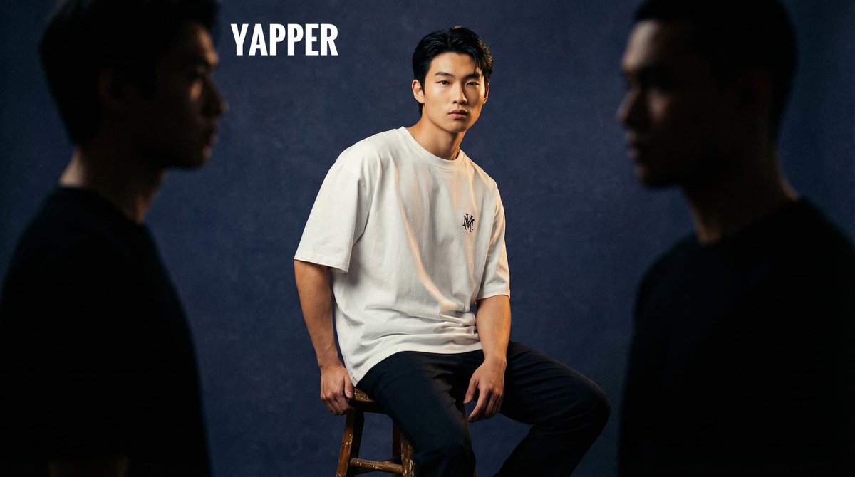 A cinematic, high-fashion studio photoshoot featuring a Gen-z male model with East Asian or Middle Eastern features, seated confidently at the center of the frame on a vintage stool. He wears a plain white oversized t-shirt with a small chest logo, similar to a minimal embroidered monogram, paired with dark bottoms. The composition is balanced and symmetrical, with two dark shadowy male figures positioned close to the camera on both sides partially framing the image and adding depth their faces blurred and unrecognizable, creating a mysterious vibe. The background is a rich, moody dark blue with slight texture like a photo studio wall, and the lighting is soft yet dramatic: a subtle key light highlighting the model's face and upper body, with a rim light giving separation from the backdrop. The color grading is inspired by luxury editorial shoots, with warm skin tones contrasting against cool shadows, deep blacks, and cinematic tones. Shot with an 85mm f/1.8 lens for shallow depth of field, the model is in sharp focus while the foreground figures are gently blurred. The overall feel is bold, mysterious, and editorial a premium fashion campaign that balances simplicity and visual drama. --ar 4:5 -- profile 7vsuyob --stylize 1000
