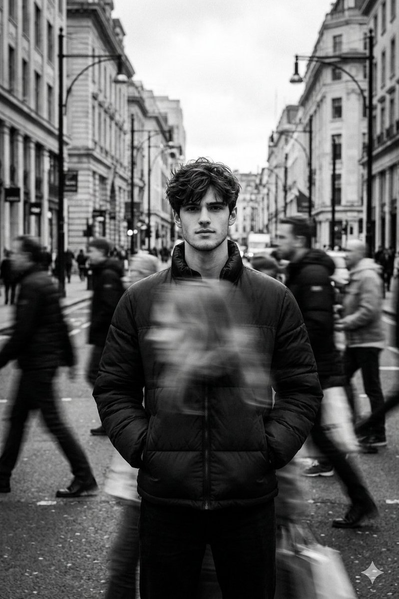 Black and White Cinematic Street Portrait with Motion Blur — Nano Banana Pro AI Generated Image