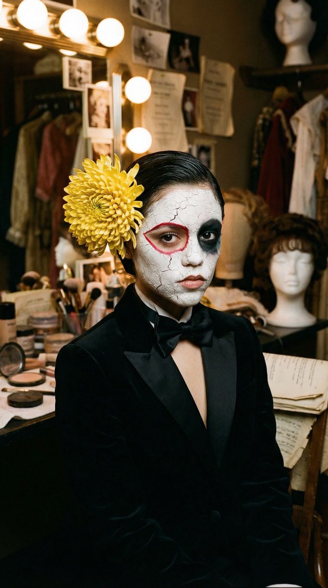 "master_prompt": "A hyper-realistic, medium-format editorial portrait of The Protagonist seated in a cramped, cluttered vintage theater dressing room. The subject is wearing a sharp, high-texture black velvet tuxedo with a silk bow tie. The face features practical, avant-garde makeup effects: the right eye is encased in a thick, cracked white clay texture with a razor-sharp crimson accent line, while the left eye is covered in a deep, matte black pigment that absorbs light like void. A large, hyper-detailed yellow chrysanthemum is pinned to the hair, its petals showing microscopic organic veins and dew drops. The surrounding environment is dense with narrative chaos: scattered makeup powders, vintage wig stands, hanging costumes, spilled sewing pins, dusty mirrors, and old scripts. Lighting is cinematic and moody, sourced from vanity bulbs reflecting off the clutter, creating a Rembrandt-style illumination on the subject's face while the background fades into a rich, textured shadow. Shot on Hasselblad H6D-100c with an 80mm f/1.9 lens, utilizing Kodak Portra 400 film emulation for creamy skin tones and organic grain. No neon, no digital gloss.",