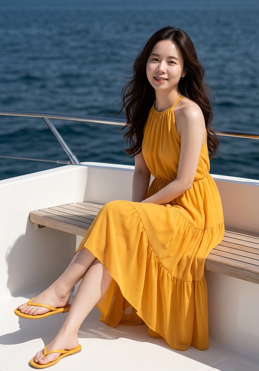 Professional fashion photography, photorealistic 8K, ultra detailed, sharp focus. A medium shot of a beautiful young adult East Asian woman with fair skin and long, dark brown flowing hair with soft waves blowing in the wind. She is sitting on the wooden deck bench on the bow of a yacht. The photo is taken from a **low angle, looking up at her**. Her body is in a **three-quarter view, angled slightly away, while her head is turned to face the camera** with a gentle, pleasant smile and direct eye contact. Her legs are extended forward towards the camera and crossed at the ankles, left leg over right, creating a slight foreshortening effect. She wears a flowing, tiered, {argument name="dress color" default="marigold yellow"} chiffon dress with a halter-neck and a matching ruffled skirt, paired with yellow flip-flops. The scene is lit by **bright, direct daytime sunlight from a high angle on the right, casting distinct hard-edged shadows** on her body and the boat. The background is the deep blue ocean under a clear sky, slightly blurred. Shot on a **{argument name="lens type" default="50mm lens"}**, f/4.0, selective focus. natural pose, no exaggeration, stick to visible elements only.