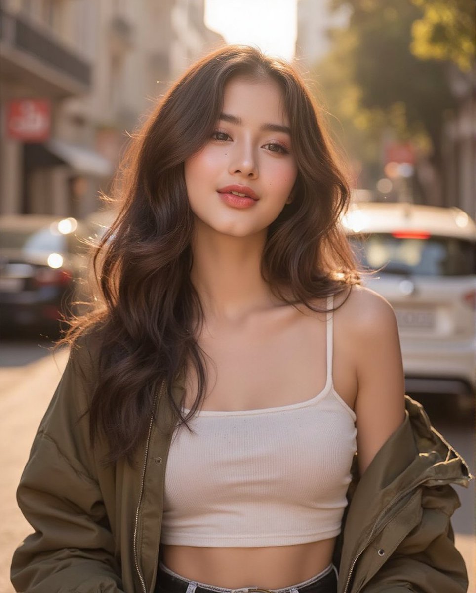 She is wearing a simple white cropped tank top paired with a loose olive-green bomber jacket draped casually over her shoulders, giving a relaxed yet stylish street-fashion vibe. The outfit is completed with light-wash vintage-style denim jeans and a classic black belt, creating a balanced casual-chic look that feels effortless and modern.