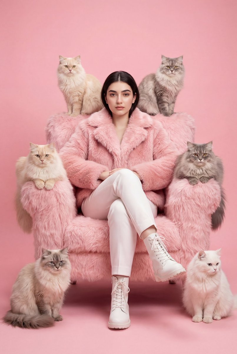 Using the uploaded picture as the only reference and without changing the face, create a fashion editorial portrait of a woman sitting confidently in a plush oversized pink faux-fur armchair against a soft pastel pink background; she wears a fluffy pink jacket, white trousers and white lace-up boots, seated with legs crossed and a calm confident expression; surrounded symmetrically by multiple fluffy long-haired cats in cream, gray and white tones perched on the chair arms, backrest and floor around her; highly stylized monochromatic pink aesthetic, soft studio lighting, clean background, luxurious textures in fur fabric and cat fur, centered composition, fashion magazine style, high detail, shallow depth of field, ultra-sharp textures, high dynamic range, 8k ultra-photorealism, masterpiece quality.