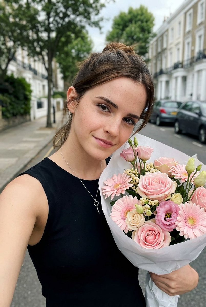 "prompt": "Natural handheld outdoor selfie of a young woman standing on a quiet residential European street during daytime, gently smiling at the camera while holding a large bouquet of soft pastel pink flowers wrapped in white paper. The bouquet contains pale pink roses, gerbera daisies, lisianthus, and small cream accent flowers arranged tightly. She slightly tilts her head toward the bouquet with a relaxed expression. Her dark brown hair is tied back in a loose bun with a few strands falling naturally near the face. She is wearing a simple sleeveless black top. The photo is taken at arm’s length as a selfie with natural perspective. Background shows leafy green trees, parked cars, street signs, and light colored residential buildings softly blurred by shallow depth of field. Lighting is soft natural daylight filtered through trees, creating gentle shadows and even skin tones. The image should look like a real smartphone photograph captured casually while walking outside, authentic colors, realistic skin texture, subtle imperfections, and natural background detail.",