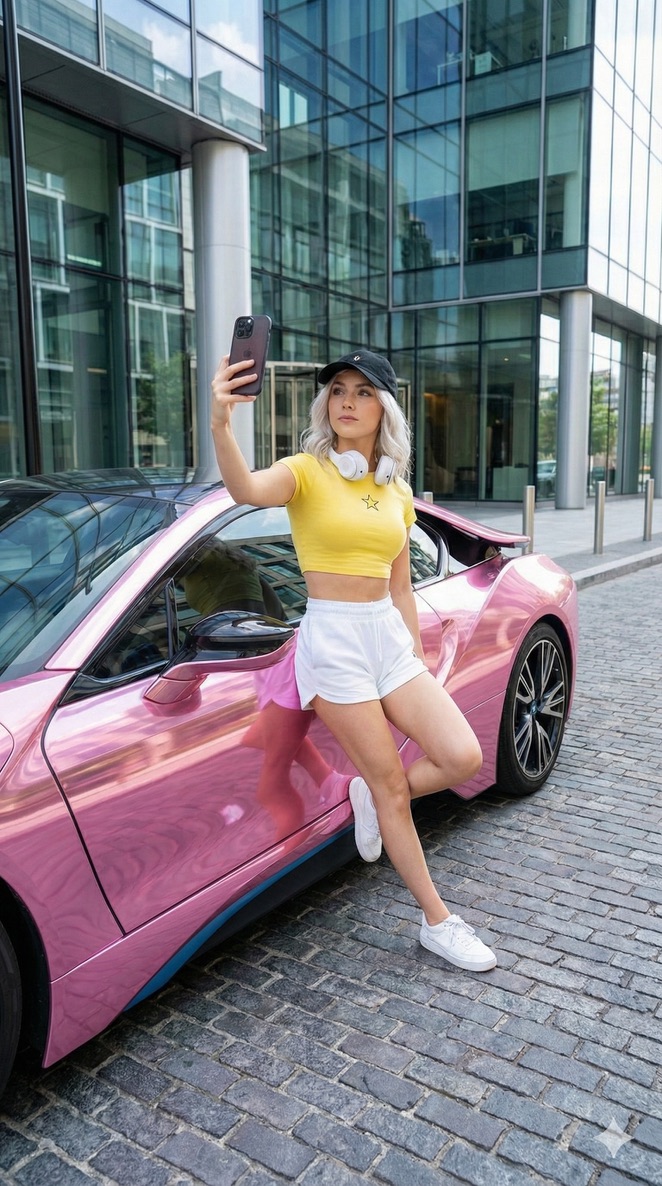 Casual Main Character Selfie with Pink BMW i8 Prompt — Nano Banana Pro AI Generated Image