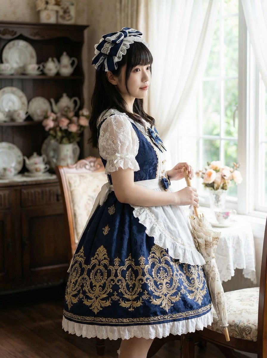 A beautiful japanese young woman Navy blue and white Lolita dress with ornate baroque design and gold trim details. White puff sleeves with lace ruffles and navy ribbon ties. Navy blue bodice with gold embroidered motifs and lace-up front corset styling. White lace collar with decorative brooch detail. Navy blue full skirt with gold embroidered patterns and brocade fabric. White lace apron overlay with ruffled edges. Navy and white hair bow accessory with lace and ribbon details. Classic Lolita style with navy, white, and gold color palette. Baroque elegant aesthetic with ornate decorative elements. NOT casual wear, NOT minimalist design, NOT modern styling.