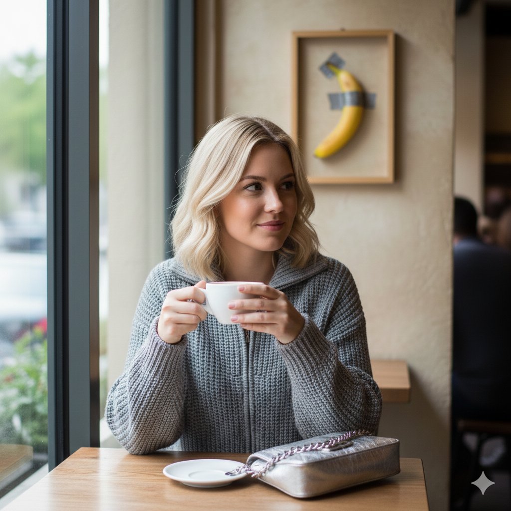 A realistic medium shot of a blonde woman sitting at a cafe table, wearing a grey knit zip-up sweater. She is holding a spoon and a white cup, smiling gently at the camera. Soft natural light from the left. Background: A banana duct-taped to a beige wall inside a frame. A silver handbag is on the table. High resolution, lifestyle photography style. --ar 3:4