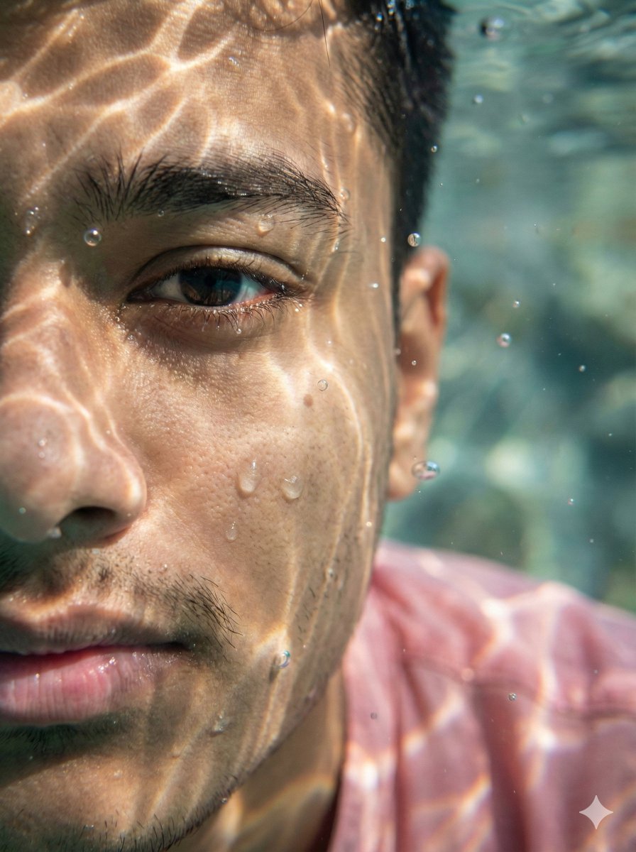 ‘Hyper-realistic, ultra-detailed close- up portrait showing only the left half of my face submerged in water, one eye in sharp focus, positioned on the far left of the frame, light rays creating caustic patterns on the skin, suspended water droplets and bubbles adding depth, cinematic lighting with soft shadows and sharp highlights, photorealistic textures including skin pores, wet lips, eyelashes, and subtle subsurface scattering, surreal and dreamlike atmosphere, shallow depth of field, underwater macro perspective. 3:4 aspect ratio’