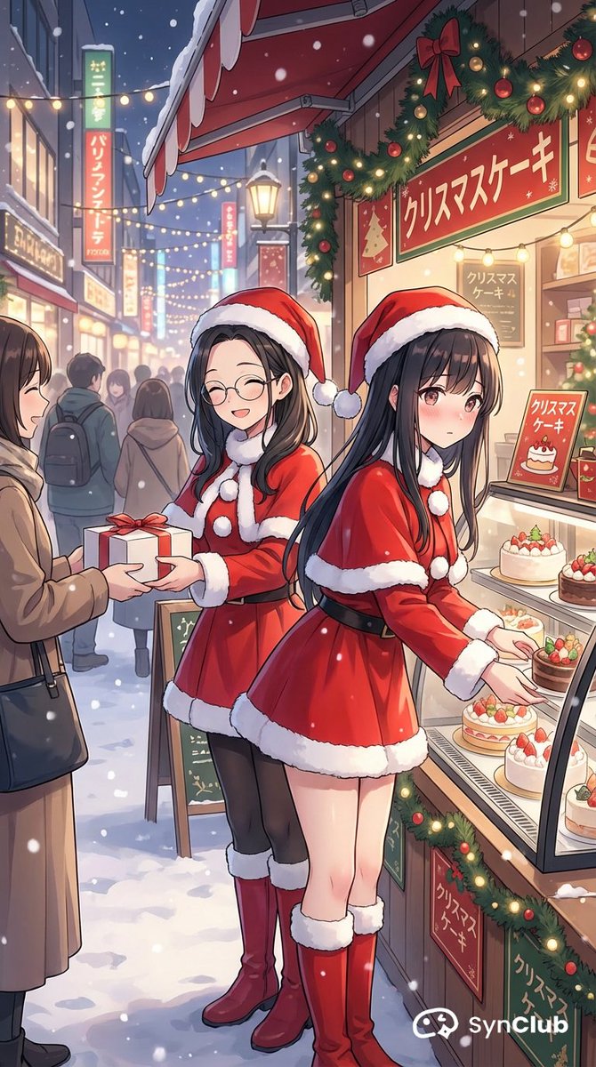 Select two characters and generate a scene where they are 'working part-time selling Christmas cakes on a street corner while wearing Santa Claus costumes'.