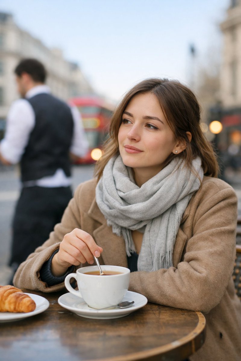 Create a photorealistic image of a young woman sitting at a relaxed outdoor restaurant in London on a cool Wednesday morning in March 2025. The sky is clear, the spring air is crisp, and the city feels calm as it wakes up. She is the focal point of the shot—wearing a light scarf, gently stirring her tea while gazing off to the side with a thoughtful expression. Everything behind her, from the waiter moving about to the soft morning traffic, should fall into a smooth blur, giving the picture the effortless, candid atmosphere of a moment casually snapped on a phone.