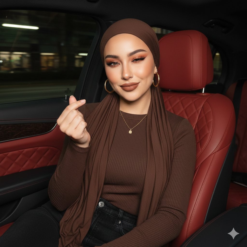"headwear": "Deep chocolate brown jersey hijab, wrapped elegantly around the head and neck",