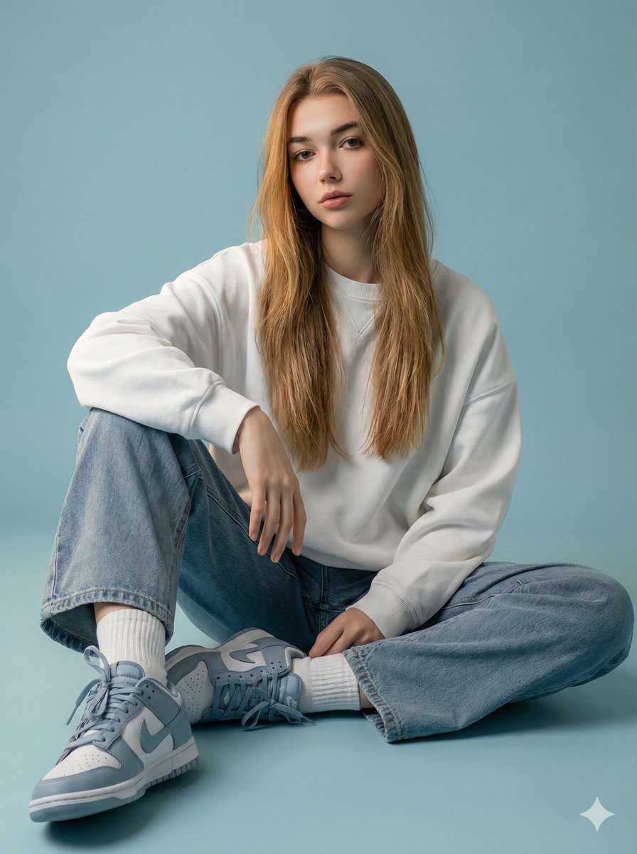 "footwear": "cloudy blue neutral sneakers or Nike sneakers",
