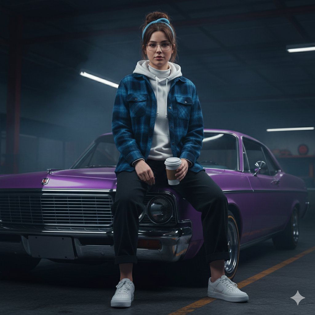 "output_goal": "Create a hyper-realistic, cinematic portrait of a tough woman sitting on a purple classic lowrider in a dark garage, with a relaxed hand-down pose and full-length trousers, preserving her exact identity while conveying a rebellious and intense mood."
