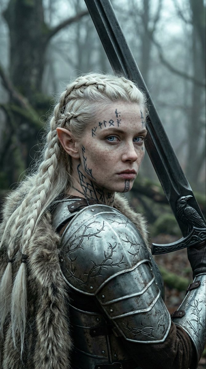 An ultra-detailed cinematic portrait of a fierce elven warrior princess. Her pale, almost white skin is dotted with delicate freckles, making her striking appearance even more captivating. Long, intricately braided platinum-blonde hair flows gracefully over one shoulder, showcasing her pointed elven ears adorned with ornate silver cuffs. Intense ice-blue eyes, framed by dark eyeliner, convey determination, enhanced by black runic tattoos resembling ancient Nordic scripts on her face and neck. Draped in a luxurious grey-white fur cloak and twisted silver armor with thorny vine motifs, she wields a massive ornate dark steel greatsword with a raven.
