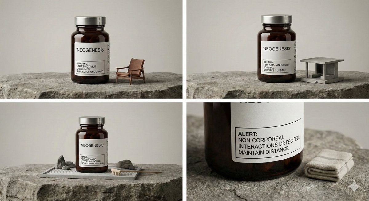 A set of calm, high-quality product photography images. The main subject is a bottle of high-end nutritional supplement. The bottle is intact and clean, with the tamper-evident seal still in place, presenting a state of high precision and strict industrial control. The product is placed on a matte stone surface. The stone texture is rough, natural, and slightly aged, contrasting with the product's refinement. The image features a clear detail of “functional displacement”: next to the supplement bottle, there is a miniature lounge chair with a clearly unreasonable scale, seemingly prepared for human rest but unusable, existing only symbolically. At the same time, a striking warning label is affixed to or near the bottle, with rational, cold text that fails to clearly state the source of the risk. The overall composition is front-centered, stable, and restrained, without dramatic angles, emphasizing the product's presence and material details. Soft but directional studio lighting is used to clearly show the reflection on the bottle, the texture of the label paper, the details of the tamper-evident seal, and the subtle texture of the stone surface. Miniature prop combination: random #nanobanana #NanoBananaPro #prompt #IdeaGeneration