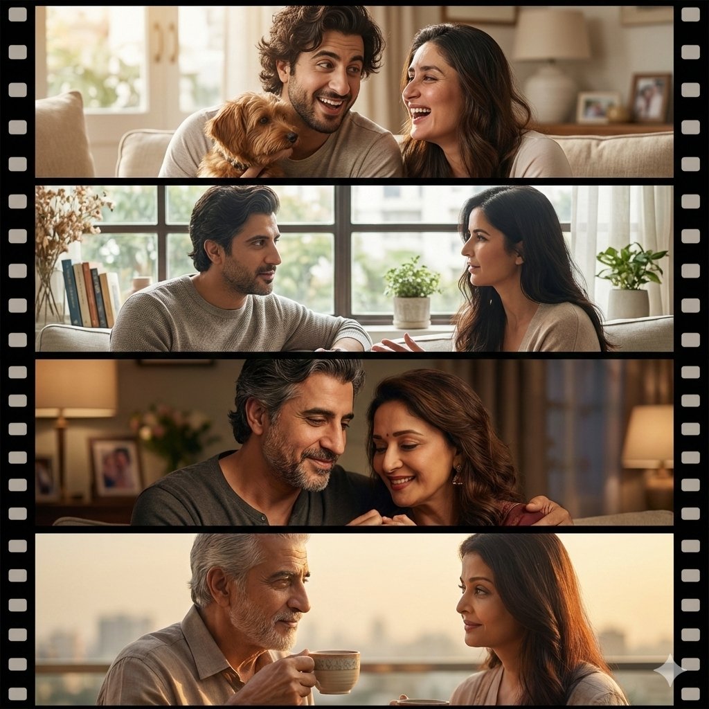 A cinematic life-journey portrait using the uploaded photo as the same person across time. The image is divided into four vertical frames like a film strip, showing the subject at different stages. First frame: handsome man with {argument name="actress 1" default="Kareena Kapoor"}— warm daylight, playful expression, soft curls, holding a small pet, cozy home setting. Second frame: handsome man with {argument name="actress 2" default="Katrina"}— thoughtful expression, casual modern outfit, seated near a window with books, natural soft lighting. Third frame: handsome Man with {argument name="actress 3" default="Madhuri Dixit"}— gentle smile, warm emotional tones, intimate indoor light. Fourth frame: handsom man with Ashwariy Rae — calm, wise expression, subtle wrinkles, holding a cup of tea, golden ambient lighting. Consistent facial features across all ages, cinematic color grading, shallow depth of field, emotional storytelling, ultra-realistic skin texture, high detail, premium editorial photography style, film-strip border aesthetic, 1:1 aspect ratio, high resolution.