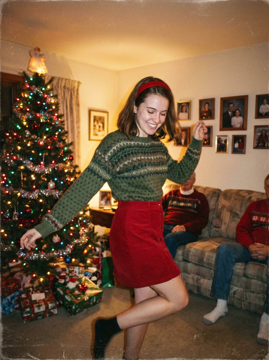 A candid indoor holiday scene photographed in a warm, nostalgic vintage style. A cozy living room decorated for Christmas, with a fully lit Christmas tree in the background adorned with glowing string lights, ornaments, and a tree topper. Wrapped presents sit beneath the tree, adding soft points of warm light. The room feels intimate and lived-in, with framed photos on the wall and people seated casually on couches in the background, slightly out of focus. In the foreground, a young beautiful attractive blond adult woman is captured mid-movement, dancing naturally. She is smiling while looking slightly downward, joyful and relaxed. She wears a {argument name="sweater color" default="green"} knit sweater with a subtle festive pattern, tucked into a high-waisted {argument name="skirt color" default="red"} skirt. A slim belt cinches the waist. She has a red headband in her hair, which is medium-length, brown, and softly styled with natural volume. Her makeup is minimal and natural, emphasizing a warm smile and expressive eyes. Her posture shows motion, one leg bent, hips angled, arms loose, giving the image a spontaneous, authentic feel. The camera angle is slightly low and close, creating a dynamic perspective and emphasizing movement. Lighting is warm and soft, typical of indoor incandescent bulbs and Christmas lights. The image has visible film grain, slight blur from motion, muted contrast, and a faded color palette reminiscent of analog film photography from the late 1990s or early 2000s. Subtle vignetting and texture overlay give the image a scanned photo look. Photorealistic but nostalgic, documentary-style family snapshot, imperfect and charming. No studio lighting, no posed feeling, pure candid holiday moment.