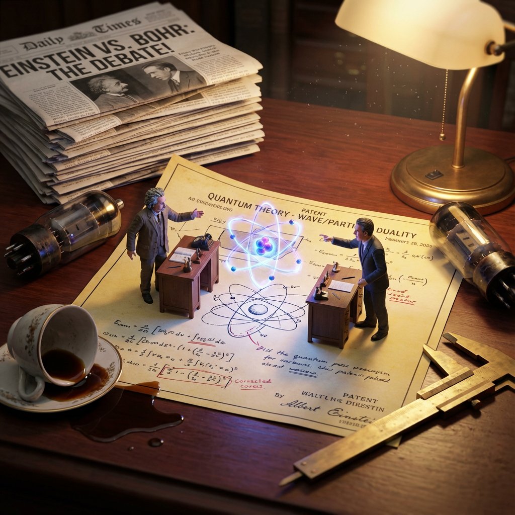 Goal: A "Macro Diorama" of a Rivalry. A messy, highly detailed flat-lay of a shared historical workspace where the two rivals exist as tiny living figurines battling over their creation.