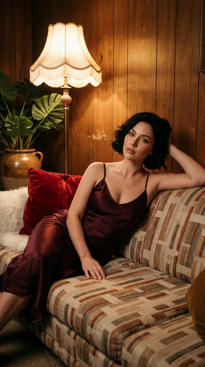 A highly structured prompt for generating a photorealistic, cinematic portrait of a woman reclining on a couch in a 1970s retro living room. The prompt specifies detailed environment elements like woo