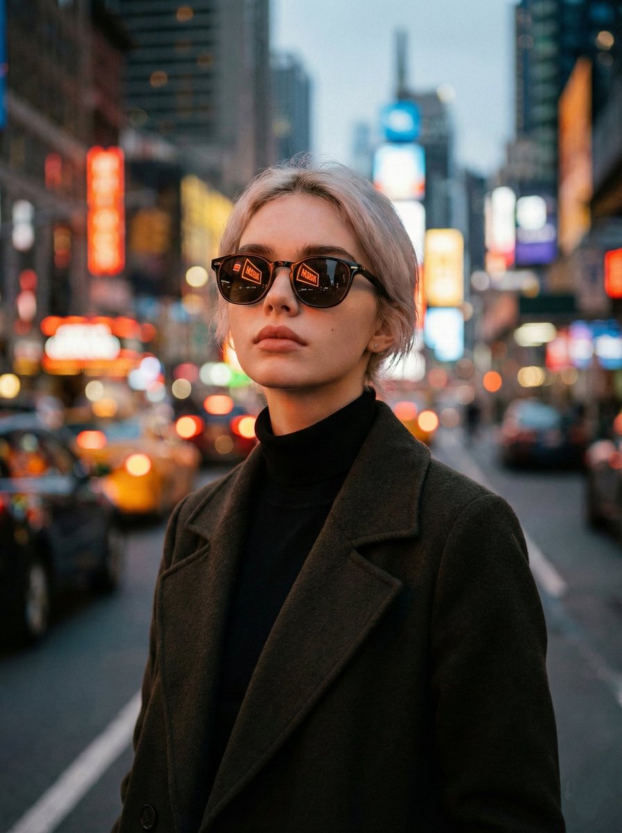 A prompt for generating a hyper-realistic, cinematic portrait of a woman standing on a bustling city street at twilight, focusing on dark fashion, dark sunglasses reflecting vibrant neon signs (bokeh
