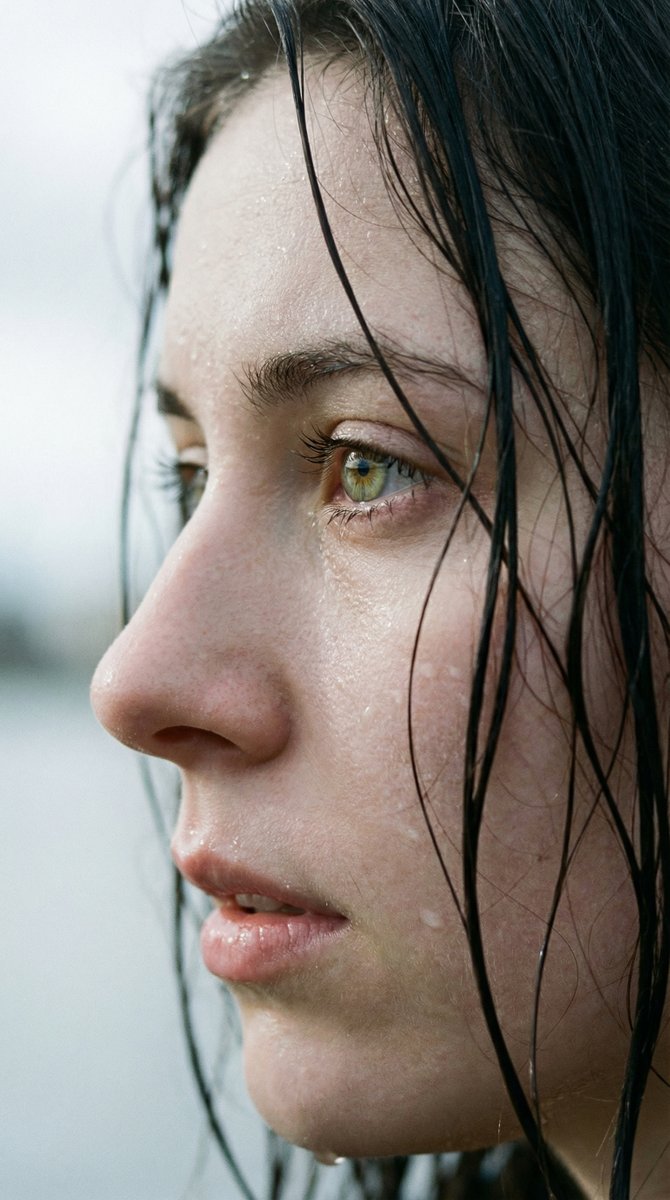 "prompt": "Extreme wet close-up portrait, side profile of a young woman. Dark wet hair strands naturally glued to the skin. Fine droplets of water and thin sweat glistening realistically on face. Focus on bright natural {argument name="eye color" default="green and hazel"} eyes with realistic reflection. Moist and shiny lips, soft natural skin texture. Soft lighting, cool color tones, light grey and white bokeh background. Hyper-realistic, 8k resolution, cinematic photography, raw style.",