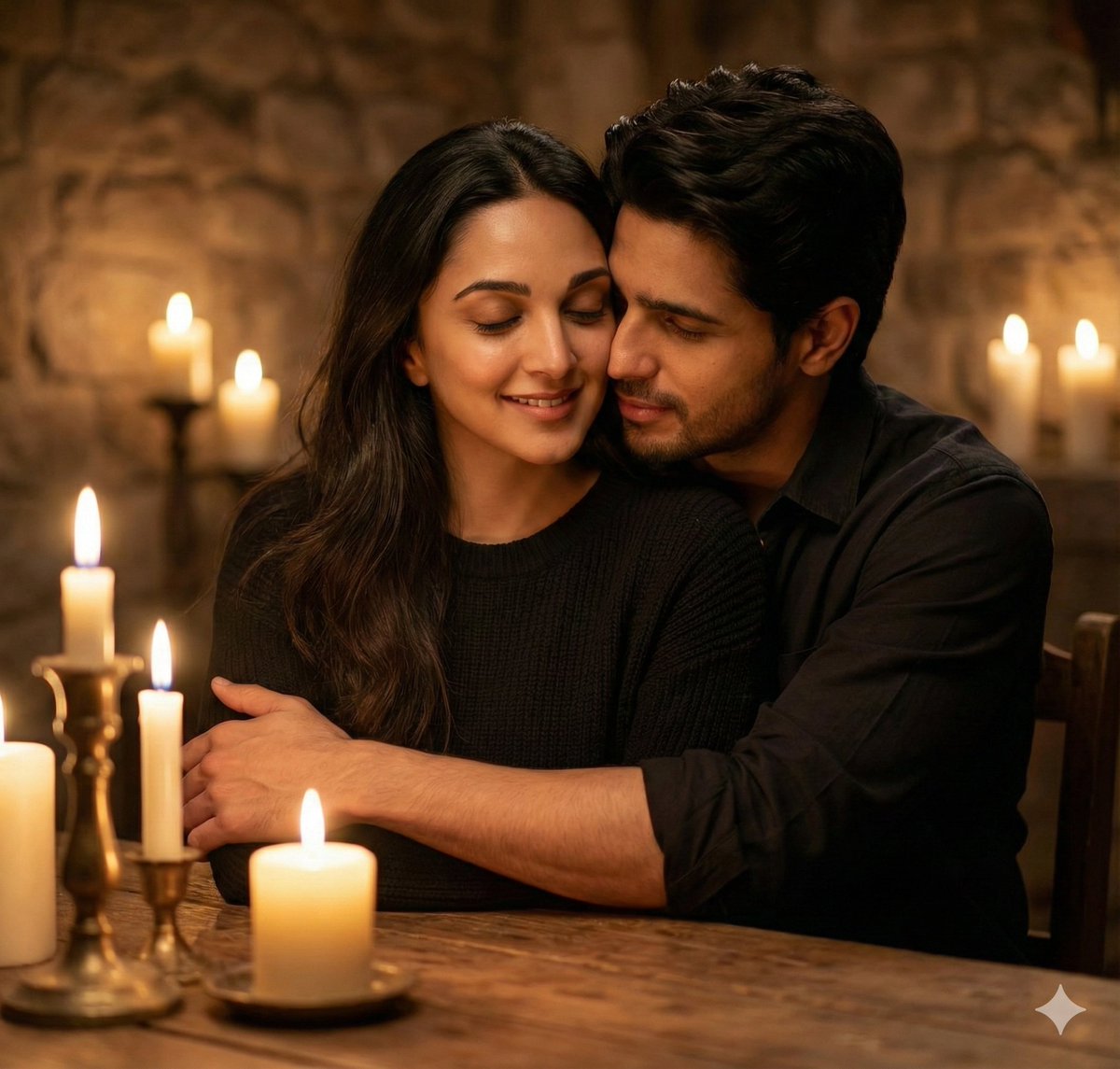 "Create a hyper-realistic, intimate romantic portrait of a young adult couple(match face from the reference image) seated closely together at a wooden table in a warm, candlelit setting. The environment feels cozy, private, and timeless, resembling a rustic stone-walled room or an old-world dining space.