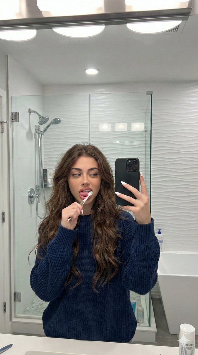 A detailed, structured prompt designed for image generation models to create a realistic, candid mirror selfie of a young woman brushing her teeth in a modern bathroom setting. The prompt specifies li