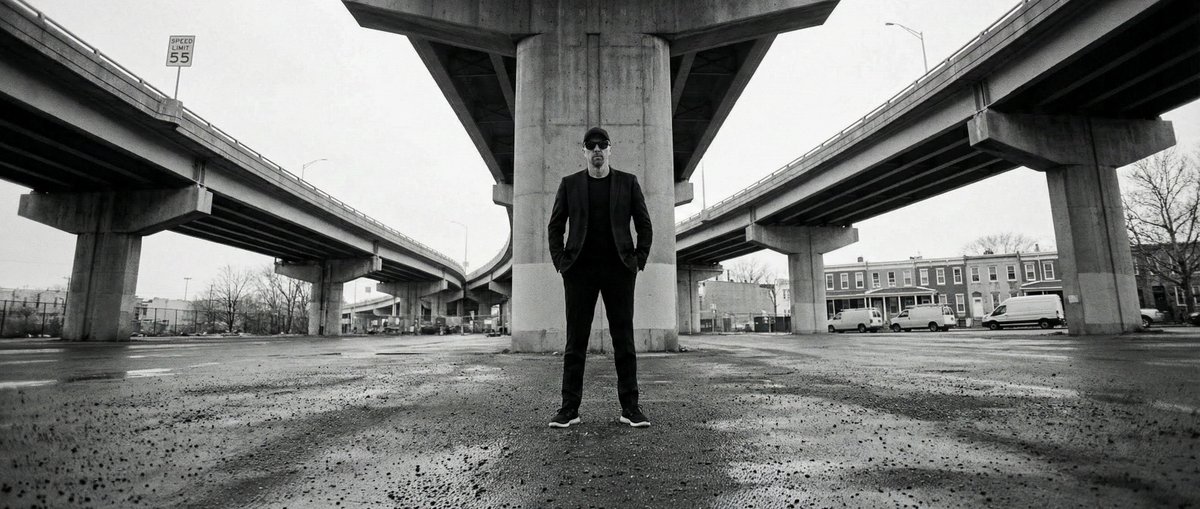 High-contrast black-and-white documentary photograph, scanned from an analog film print/book at high resolution, with subtle film grain, faint dust specks, and slight print texture. A wide-angle or fisheye lens creates visible curvature in the elevated roadways as THE_SUBJECT from the uploaded reference photo stands centered in the lower-middle foreground beneath a massive brutalist concrete highway interchange in the United States. THE_SUBJECT’s appearance must match the reference image exactly with zero deviation—no changes to face, hair, clothing, accessories, body type, or expression. The camera is eye-level with deep focus, keeping THE_SUBJECT and distant background elements sharp. Towering reinforced-concrete piers and curving interstate overpasses dominate the upper frame, forming a strong V-shaped architectural canopy above THE_SUBJECT, emphasizing human scale against infrastructure. Overcast daytime skylight provides soft, diffused overhead lighting, while gritty high-contrast processing delivers rich blacks and controlled highlights. Rectangular U.S. speed-limit signs reading “{argument name="speed limit" default="SPEED LIMIT 55"}” are visible on the elevated roadways. The environment includes worn asphalt and concrete pavement with a slight damp sheen in the foreground, leafless trees in the distance, parked box trucks and utility vans, and older urban residential buildings in the far background. The overall mood is cold, industrial, and somber, with a stark, archival street-photography feel.