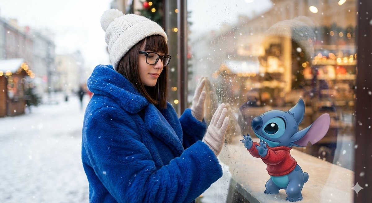 Create an ultra-photorealistic winter outdoor portrait of a young brunette woman with straight dark hair, front bangs, and wearing stylish black rectangular glasses. She is with a soft heart-shaped face, warm skin tone, natural makeup with subtle blush and nude lips, and a friendly, gentle smile. The woman is dressed in a thick, cozy royal-blue winter coat made of plush or faux-fur material, with a large collar and long sleeves. She wears a knitted white beanie with a pom-pom on top. Her hands are raised and gently pressed against a glass surface, as if interacting with a small animated character on the other side. The character is a playful, cartoonish blue creature similar in style to {argument name="animated character reference" default="Stitch"}, wearing a tiny knitted sweater. It is standing on its hind legs, front paws pressed against the glass mirroring the woman's hands, looking at her with large expressive eyes and an adorable joyful expression. Background: softly blurred winter cityscape or storefront window, warm lights behind the glass, gentle snow falling all around, faint snowflakes on the glass, cozy and festive atmosphere. Reflections of warm light in the glass and subtle bokeh from distant lights enhance depth. Lighting: soft, diffused natural winter daylight, slightly warm backlight from behind the glass, subtle rim light on the woman's face and hair, creating a cozy, inviting mood. Composition: medium shot, from mid-thigh up, eye-level perspective, focus sharp on the woman's face and glasses, slight depth of field blur on background and animated character's surroundings.