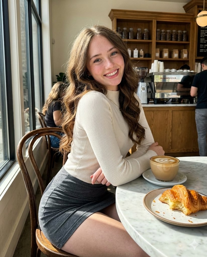 •Background (SHARP): A detailed luxury café interior. On the table, an aesthetic cappuccino with latte art and a half-eaten croissant on a ceramic plate are visible. In the background, wooden shelves with coffee beans, a chrome espresso machine, and other diners are all perfectly IN FOCUS. No artificial blur.