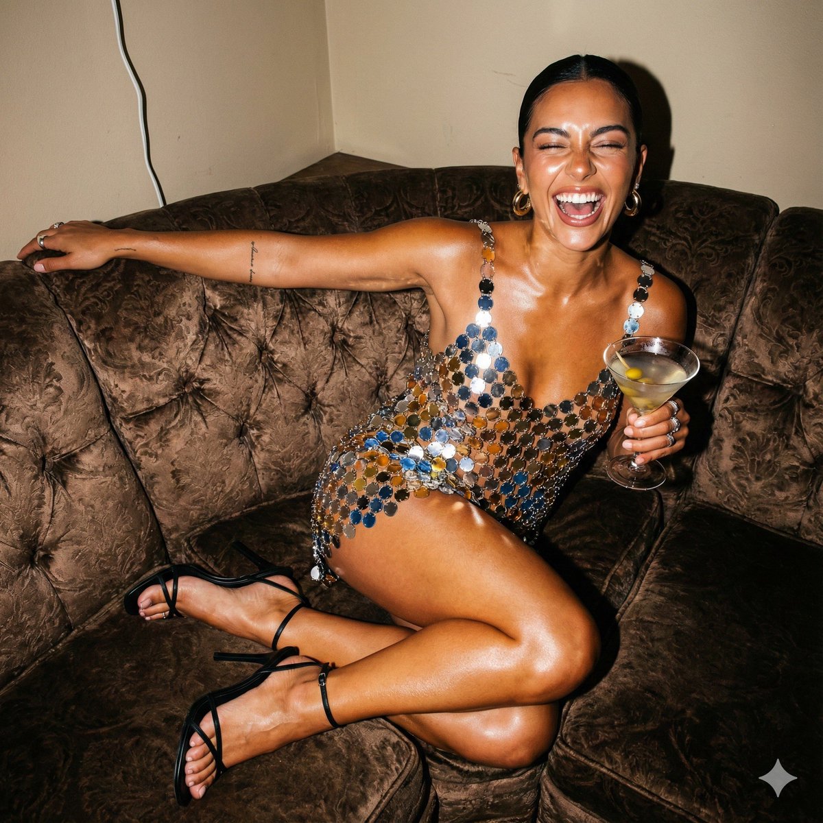 "atmosphere": "spontaneous party moment, playful glamour, exclusive after-party vibe"