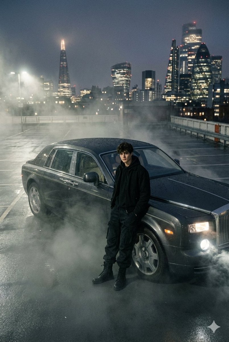 A concise prompt for generating a moody, atmospheric fashion editorial photo of a young man posing in front of a Rolls-Royce on a rooftop parking lot with the London skyline visible at night. The prom