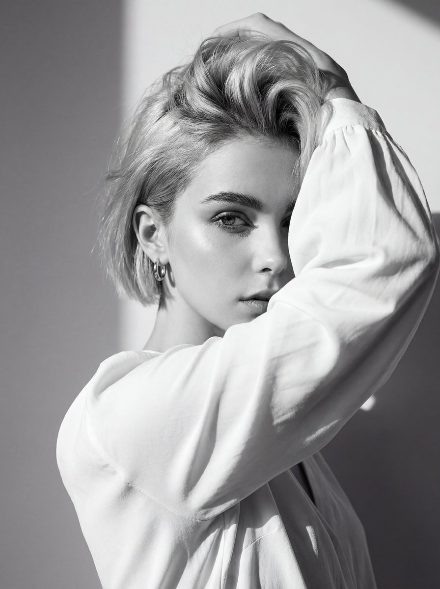 Use the attached image of the model as facial reference and physical features. Black and white high-fashion editorial portrait of uploaded person, wearing a loose white blouse. She poses with one arm raised, partially covering her face while holding her hair up, creating a dramatic and artistic composition. Her gaze is intense and captivating, directed toward the camera, exuding a strong, enigmatic aura. Background: minimalist plain wall with sharp natural daylight casting defined shadows, adding depth and contrast. Lighting: harsh natural sunlight, high-contrast setup highlighting facial contours, sharp cheekbones, and texture of the hair and fabric. Pose: bold and expressive, arm lifted framing the face, emphasizing raw emotion and editorial style. Camera: eye-level angle, close-up framing focusing on facial expression, texture, and dramatic shadow play. Captured with a Canon EOS R5 full-frame DSLR, 85mm f/1.8 lens for crisp detail, tonal depth, and fine grain. Style: high-fashion editorial in monochrome.