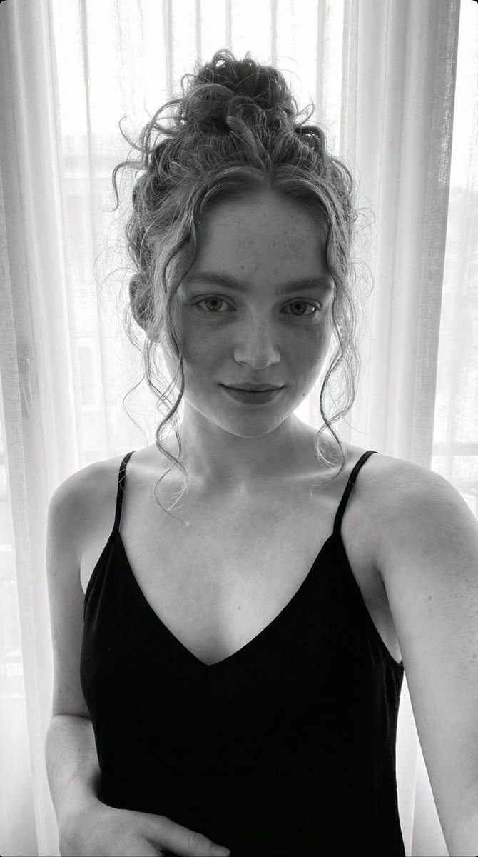 A structured prompt for generating an intimate, photorealistic black and white portrait, mimicking a candid selfie taken with a film camera or iPhone. It details the subject (blonde curly hair in a me