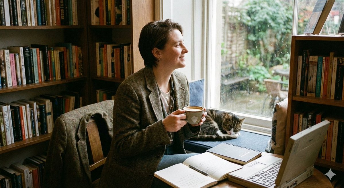 Generates a photorealistic, cinematic image of a person sitting near a coffee window in soft natural daylight, focusing on a warm, peaceful, and candid lifestyle aesthetic.