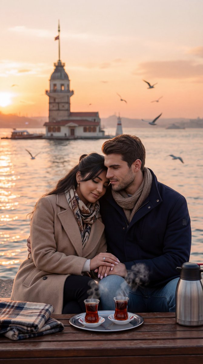 "scene_summary": "2026, Uskudar seaside. Maiden’s Tower in the background. The couple is sitting side by side on a bench; hands intertwined; shoulder to shoulder; tea from a thermos, traditional Turkish tea glasses, a light blanket. Final feeling: peace and lasting love.",