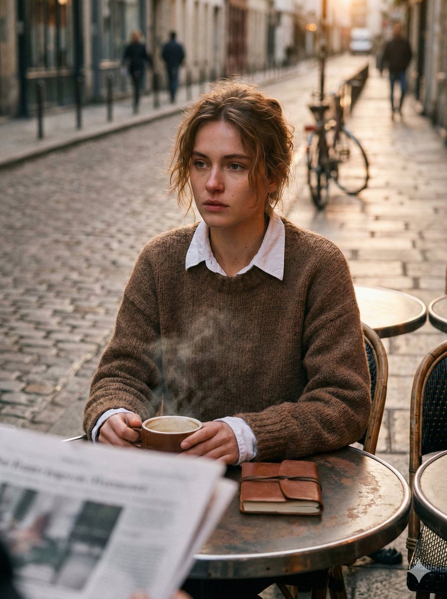 "full_combined_prompt": "Ultra-realistic fashion editorial portrait of a young woman sitting at a street café during sunrise. The street is nearly empty, asphalt still damp. Warm morning light touches her face softly. She wears a white collared shirt layered with a textured brown sweater. Her expression is introspective, vulnerable, diaristic in the spirit of Nan Goldin. Steam rises from her coffee cup, blurring the foreground. Cinematic grain, natural tungsten, imperfect focus, emotional realism, humidity, analog softness. Sony A1 + 85mm f/1.8 --ar 3:4"