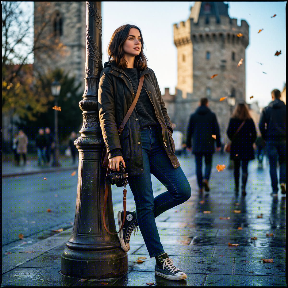 "Please use the female user’s reference photo to accurately apply all of her facial features. Edit this image — transform the photo into a high-end street-photography portrait of a female traveler/photographer leaning casually against a lamp post in front of a {argument name="historic landmark" default="historic tower"}. Pose & composition (preserve): Standing with the left leg bent and foot resting on the lamp base, right leg relaxed. Left hand tucked into the jacket pocket, right hand holding a camera down by the thigh. Shoulders slightly turned toward the camera, chin gently lifted, gaze looking off-frame with a calm, confident expression. Keep the original framing and body alignment. Wardrobe & accessories: Keep the dark parka/jacket, enhance fabric texture with a subtle waxed canvas or premium matte finish Replace inner layer with a soft charcoal or muted knit sweater Retain blue jeans, deepen to rich indigo with natural creasing and realism Emphasize high-top sneakers — increase contrast on black-and-white panels, add light scuff details Add a slim messenger bag strap across the chest Add a compact leather wrist strap on the camera Optional: minimal jewelry (small studs or thin ring), understated and editorial Lighting & color grading: Cinematic cool-tone color grade with soft blue shadows. Add a warm golden rim light hitting the left side of the face and shoulder (late-afternoon sun feel). Slight contrast and midtone boost while preserving natural skin texture. Add subtle film grain and a gentle vignette to draw focus to the subject. Camera & optics look: Emulate a 35mm–50mm prime lens, shallow depth of field (f/1.8–2.8). The tower and pedestrians fall into smooth, painterly bokeh while the subject remains razor-sharp. Apply slight perspective correction so the tower peeks elegantly behind her shoulder. Enhance eye catchlights (or sunglasses reflection if present). Sharpen camera body and lens details. Background & atmosphere: Maintain the busy pedestrian environment but soften and desaturate it to make the subject pop. Increase clarity and texture on the historic stone tower for architectural strength. Add a few falling autumn leaves and a subtle wet-pavement sheen suggesting recent rain, with light reflections near the shoes. Final touches: Natural skin retouching (preserve pores and fine detail), boost micro-contrast on jacket and jeans, enhance glass and metal reflections on the camera. Export as photorealistic, vertical 4K editorial cro