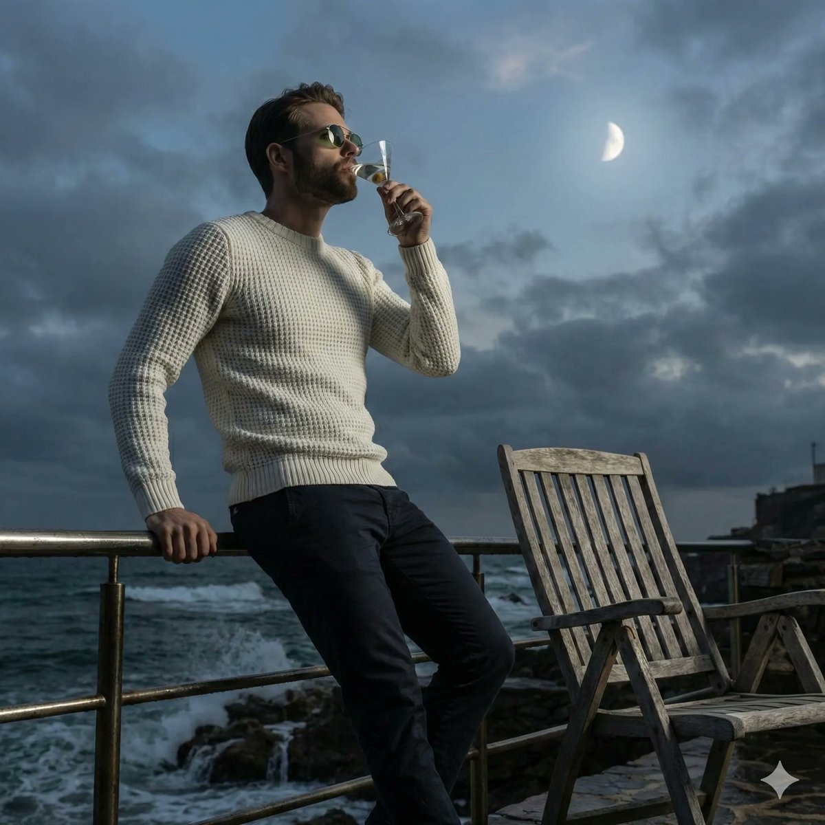 Use the attached reference image to create a person seated on a terrace, calmly sipping a {argument name="drink" default="martini"} while gazing out at the sea.
