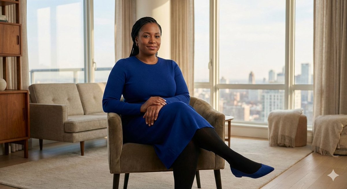 "action_input": "A stunningly beautiful woman with intricately styled dark braided hair sitting with effortless confidence and grace. She is posed with her legs elegantly crossed, wearing a sophisticated {argument name="dress color" default="royal-blue"} long-sleeve midi dress that fits perfectly, paired with opaque black tights and matching royal-blue pointed-toe flats. Her expression is calm, serene, and empowered. She is positioned in the center of a luxurious, contemporary penthouse living room featuring high-end minimalist decor, soft oatmeal-colored walls, sleek mid-century modern furniture, and warm polished walnut wood accents. The lighting is cinematic and professional, using a shallow depth of field to create a soft bokeh background. Warm ambient light catches the texture of her braids and the rich pigment of her dress, while a gentle key light highlights her facial features. The overall atmosphere is polished, airy, and high-fashion, with a clean, refined aesthetic and crisp, high-resolution details."