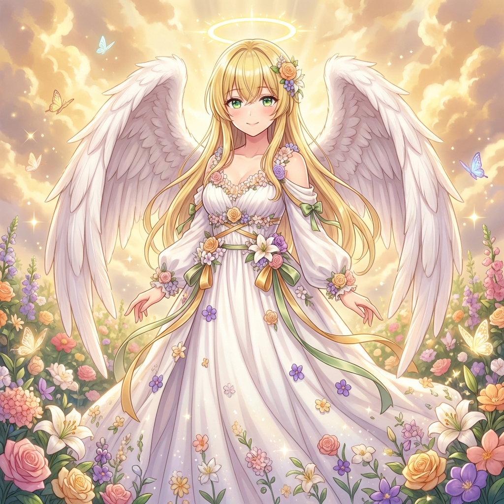 A user generated an image of a guardian angel surrounded by flowers and light using Nano Banana Pro, sharing the prompt in the ALT text for others to try.