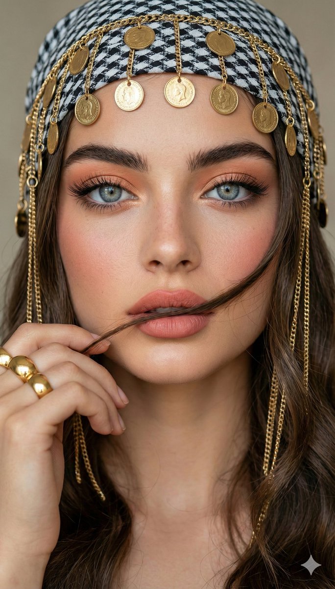 Convert the uploaded image into A stunning woman in a close-up portrait pose. holding a strand of her wavy brown hair in front of her lips. She has captivating grey-blue eyes, soft glam makeup with peach eyeshadow, long lashes, bold eyeliner, rosy blush, and peach-pink matte lips. She is wearing a black-and-white patterned headscarf decorated with hanging gold coins and chains. Long gold chain earrings frame her face. She wears a chunky gold ring on her finger, clearly visible as her hand is lifted near her face Background is neutral, softly blurred beige tones. Ultra-realistic, 8K detail, sharp focus on eyes, smooth skin texture cinematic lighting. face features remain the same.