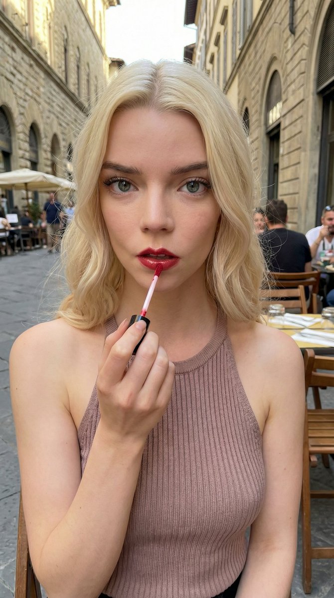 "prompt": "Outdoor cafe beauty portrait, young woman with {argument name="hair color" default="platinum white blonde"} shoulder length wavy hair, applying red lip gloss with applicator wand to lips, looking directly at camera, light green blue eyes with long dark lashes, wearing pink taupe ribbed knit halter neck top, natural makeup with defined brows, glossy red lips mid-application, fair porcelain skin, sitting at outdoor cafe terrace in {argument name="location" default="Florence italy"} with wooden chairs and tables in background, other cafe patrons blurred behind, Italian street cafe setting, natural daylight, candid beauty moment, close-up portrait selfie style, influencer content aesthetic",