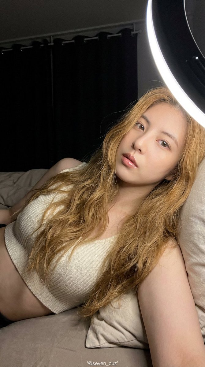 "hair": "long voluminous wavy honey-blonde hair with golden highlights, cascading over pillow and shoulder, realistic strand separation, soft bounce and strong shine from direct ring light illumination:1.2",