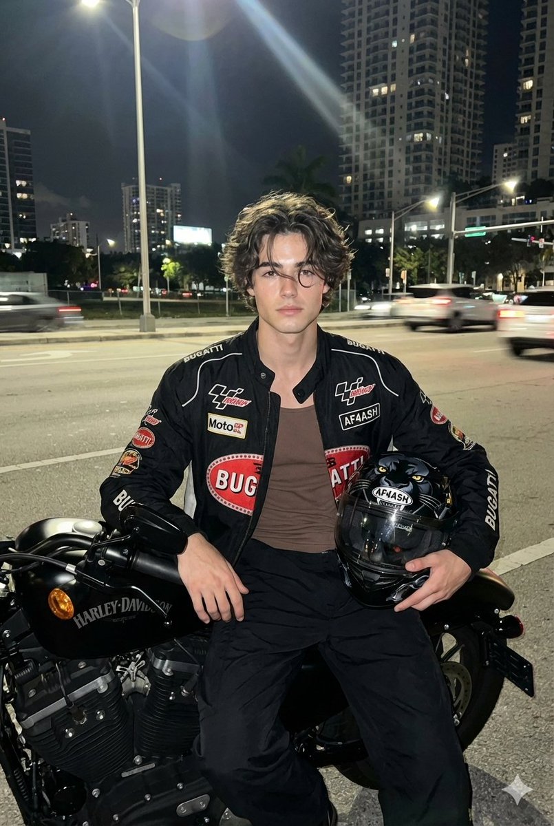 Realistic outdoor nighttime handheld smartphone photo, random candid and unposed. Replace the subject's face with my uploaded reference exactly 1:1 same identity, facial structure, proportions, and skin tone. The subject sitting on a black harley davidson motorcycle on a roadside at night. He is seated on the bike seat, torso slightly leaned forward. He is holding a black panther graphic motorcycle helmet and with brand name af4ash written which meant to be not visible, Merge with the graphic. One hands near the fuel tank and looking directly into the camera. Camera flash is ON, creating strong frontal light on the face and upper body with deep background shadows, typical of real phone flash photography. The face has a natural glass skin glow. calm confident expression. medium length Weavy Messy hairstyle. Messy strands of hair falling naturally near the eyes. Eyes partially visible. Wearing a brown sleeveless tank top and a black buggati biker jacket worn open, multiple moto gp inspired patch and a small patch of af4ash brand on jacket, which should be merged with other patches. Black baggy-fit pants. Background includes motion blurred blurred urban road, nearby tall buildings, street lights and building ambience mixed with phone flash. Shot at eye level with natural smartphone perspective, sharp but realistic focus, slight low-light grain. No Sunglasses, No filters, no cinematic grading, natural realistic look