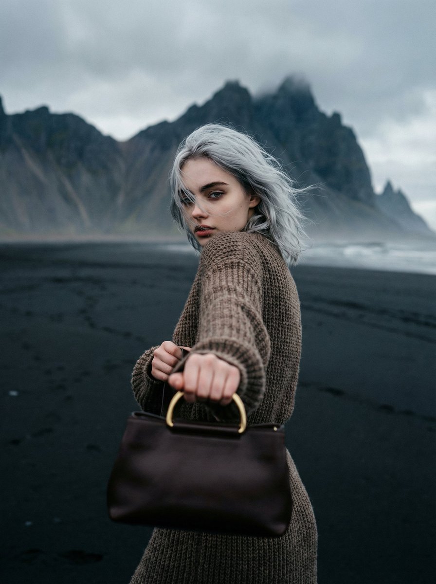 A cinematic fashion photograph of a young woman standing on a black sand beach near a cold northern coastline, dramatic jagged mountains rising in the background under an overcast sky. She wears a textured brown knitted sweater dress and carries a dark leather handbag with a gold handle. Minimalist Nordic aesthetic, muted cool color palette, moody atmosphere, soft natural light, shallow depth of field.