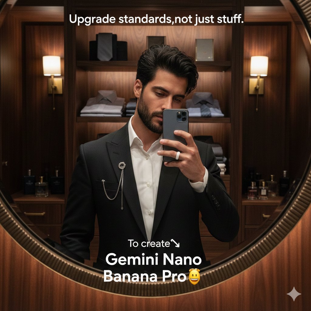 A highly detailed prompt for generating a photorealistic, editorial luxury lifestyle image of a handsome young man taking a party selfie in a lavish walk-in closet. It specifies his appearance (messy