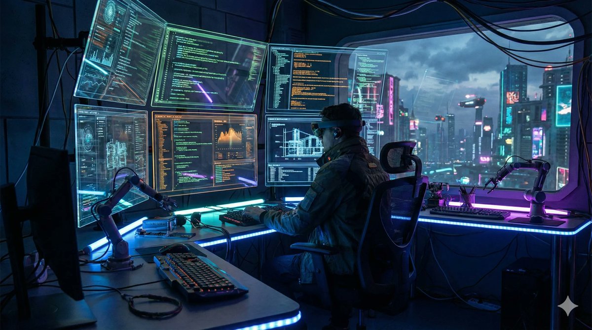 "scene": "{argument name="scene description" default="futuristic AI workspace with holographic screens showing code"}",