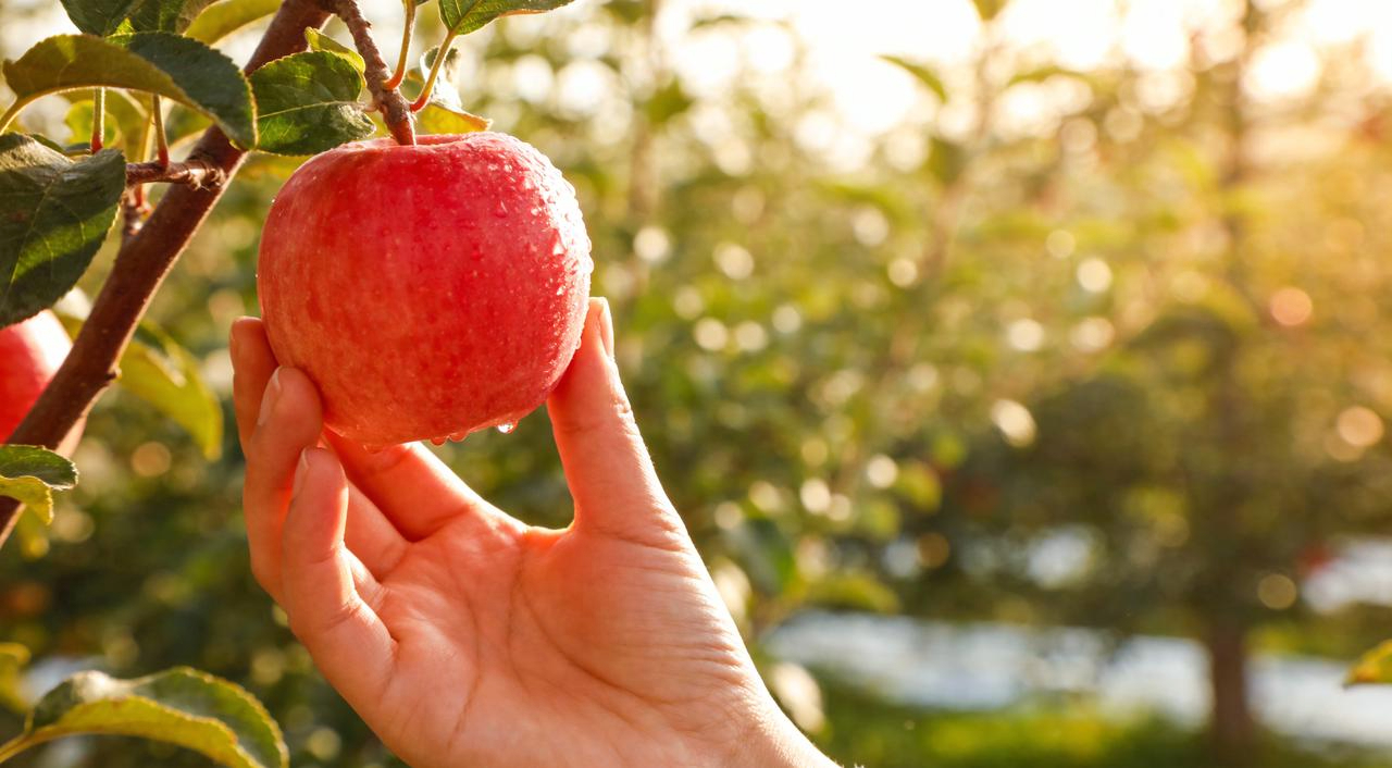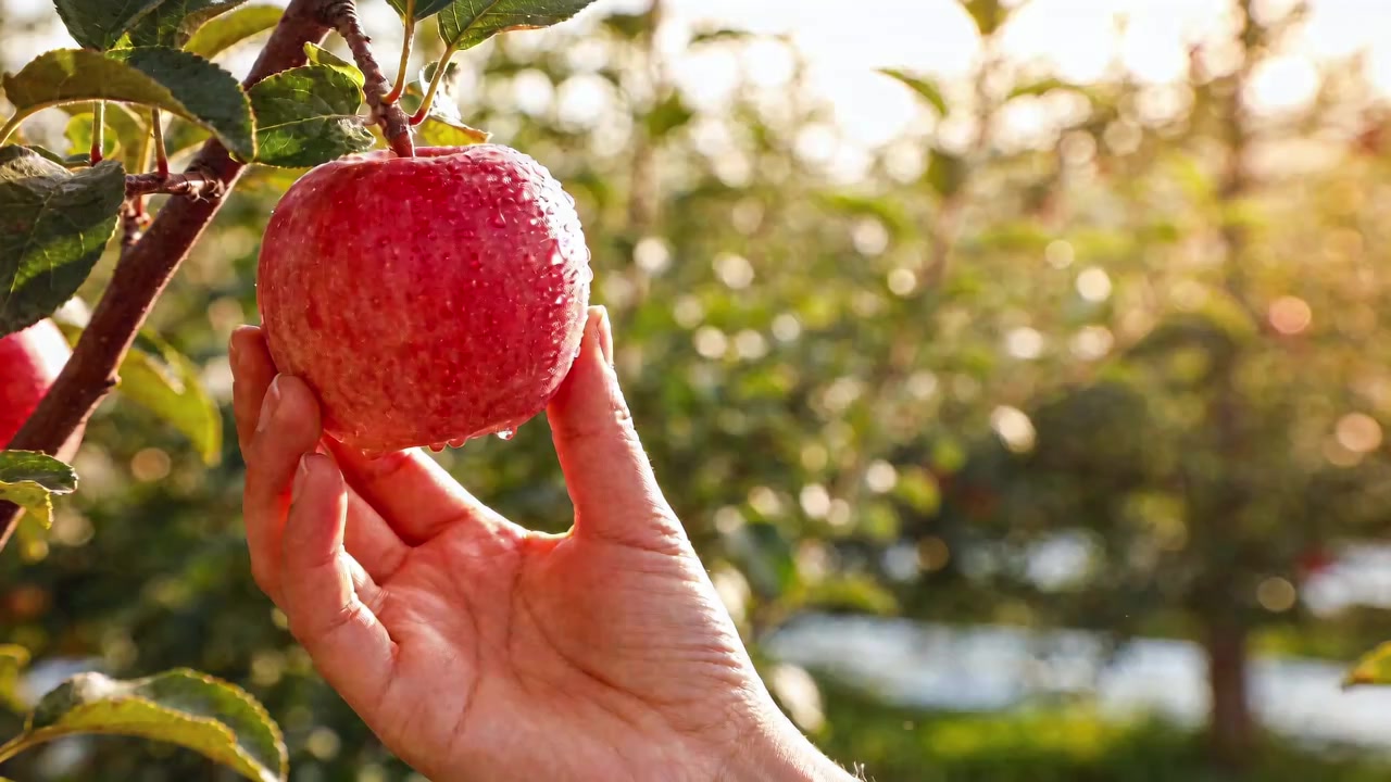 @Image 1, your hand picks a dew-covered Aksu red apple with a crisp collision sound; 2-4s: Quick cut, your hand drops apple chunks into a shaker cup, adds ice and tea base, shakes vigorously, ice collision and shaking sounds synced to upbeat drumbeats; 4-6s: First-person close-up of the finished product, layered fruit tea poured into a clear cup, your hand squeezes cream topping across the top, applies a pink label to the cup, camera zooms in on the layered texture; 6-8s: First-person hand raises cup, you lift the fruit tea from