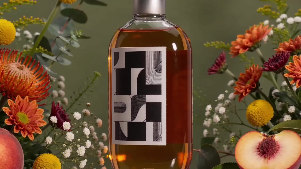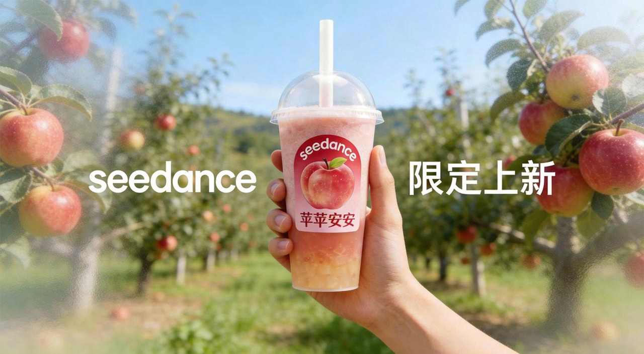 @Audio 1 as background music throughout. First-person perspective fruit tea promotional ad for seedance brand 'Peaceful Apple' apple fruit tea limited edition. First frame is