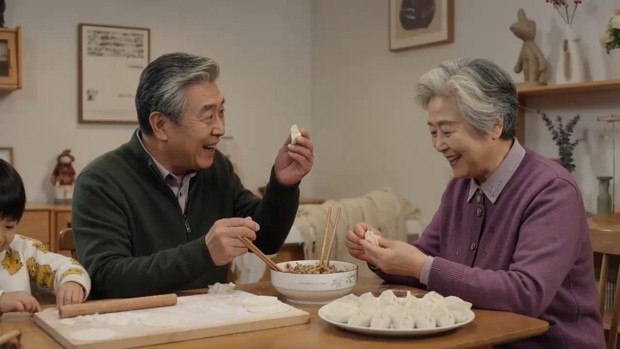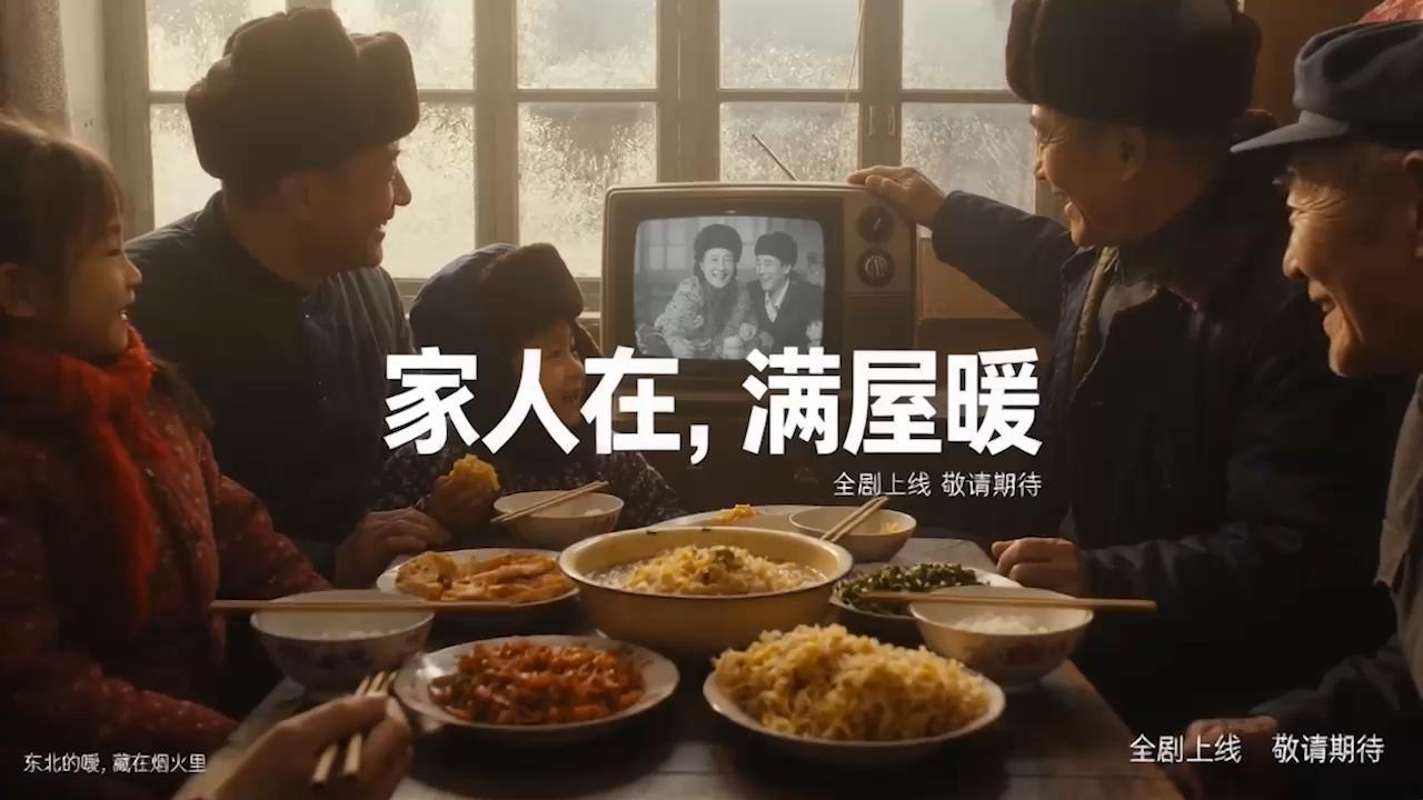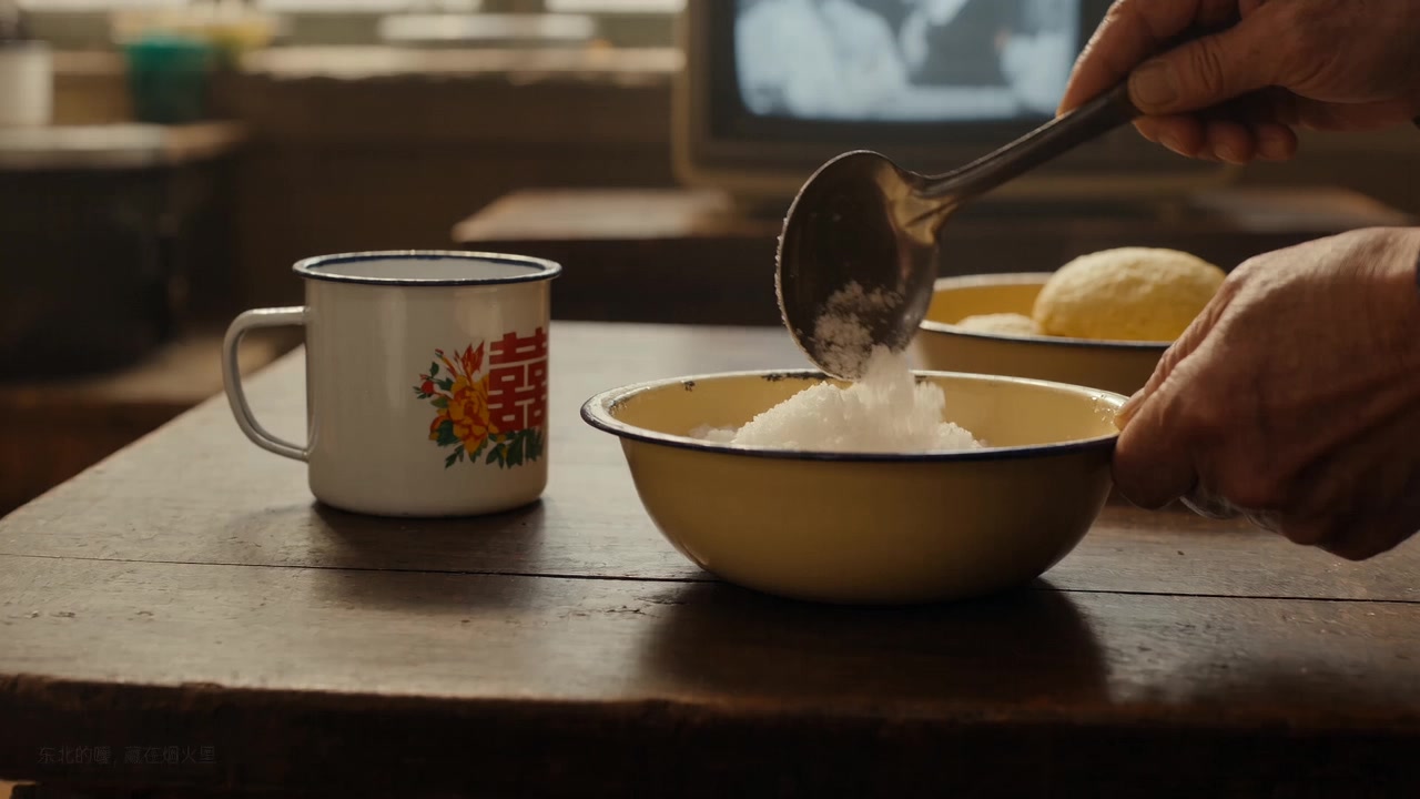 @Video 1 forward. Core: 1980s Northeast China street life + family warmth, raw and authentic yet tender without being sentimental, building emotional resonance through everyday details and subtle family interactions. Visuals: Warm yellow nostalgic film texture, caramel brown / persimmon red / cream white as main colors, slight film grain + vintage VHS soft glow. Sound: Nostalgic Northeast accordion/suona light instrumental + ambient life sounds as BGM. Subtitles: Simple white Song typeface small text, no effects. Lighting: Northeast old house windowsill warm yellow natural light (70% brightness) + 100W tungsten filament fill light (40% brightness), natural soft shadows, softened highlights, shallow depth of field highlighting characters. Camera: Fixed focal 35-70mm, slow push (0.8x) + gentle handheld follow (1x) + beat-synced slow cuts (2-3s per shot), recreating the texture of life in old Northeast houses. Persistent subtitle: Lower-left tiny text 'The warmth of the Northeast hides in the everyday.' 0-1s [Everyday Opening]: Slow push macro close-up 35mm, beside the old wooden kang table a red Double Happiness enamel mug steams, rough hands pinch an iron spoon stirring rock sugar, alongside a large floral porcelain bowl and tin candy box, background wall pasted with New Year paintings, dried chili strings hanging from ceiling beams, warm light washing over everything. 2-3s [Warm Beat 1]: Gentle handheld follow 50mm, Mom in a blue-and-white checkered apron presses cornmeal cakes by the stove, turning to smile at the child running in wearing a floral padded jacket and ushanka hat, background showing an iron stove and frozen pears and persimmons on the windowsill, sunlight casting warm dappled shadows. 4-5s [Warm Beat 2]: Close-up 50mm, the whole family gathered around the kang table, grandpa sips from an enamel liquor cup and places sauerkraut-and-pork on the child's plate, the child offers a bitten cornmeal cake to grandma, the table laid with stewed sauerkraut noodles and corn porridge, folded floral quilts on the kang. Background music uses